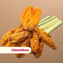 Rapeaksi friteerattuja kanansiipiä, kasvistikkuja, aurajuustoa ja siipikastiketta dipit (L,G)